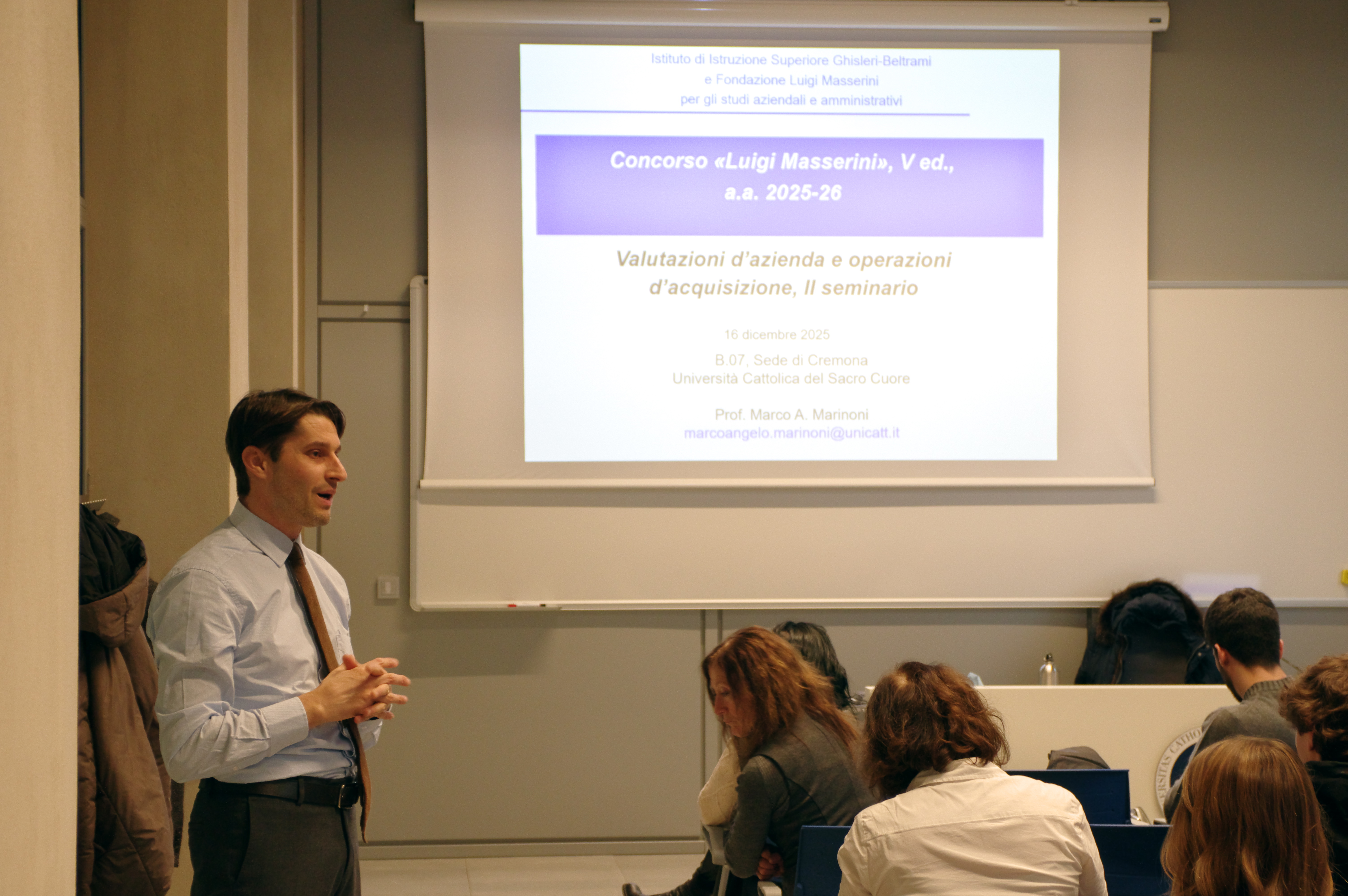 L’incontro di natura seminariale del 2 dicembre 2025, curato dal Prof. Marco Angelo Marinoni, Professore Associato, docente dei Corsi di “Contabilità e Bilancio”, “Revisione legale dei conti” e “Operazioni straordinarie”, presso la Facoltà di Economia e Giurisprudenza dell’Università Cattolica del Sacro Cuore (sede di Piacenza e Cremona), si è tenuto presso il Campus Santa Monica dell’Università Cattolica ed è stato rivolto a tutti gli studenti delle classi quinte dell’indirizzo economico dell’Istituto “Ghisleri-Beltrami”. La lezione, a carattere introduttivo, ha trattato il tema oggetto del concorso “Valutazioni d’Azienda e operazioni di acquisizione” analizzando le caratteristiche del Bilancio d’Esercizio, del Capitale Economico nonché gli aspetti più significativi delle operazioni straordinarie.