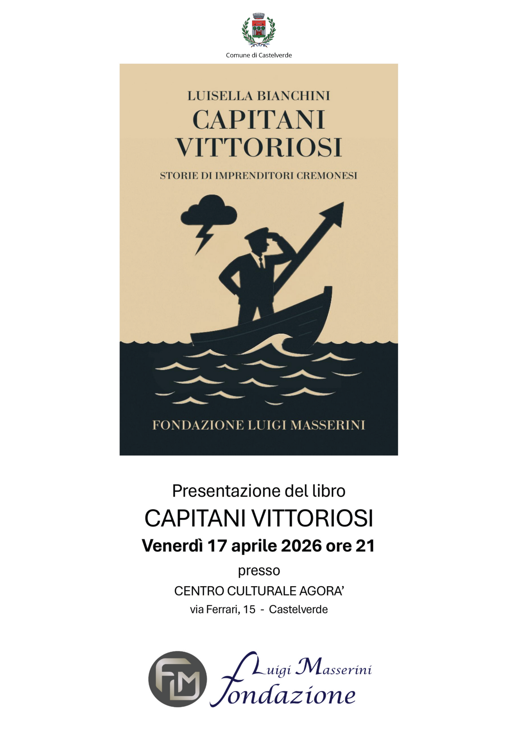 La Fondazione Luigi Masserini ha rinnovato la promozione del Progetto Editoriale Luigi Masserini Editore attraverso la presentazione del libro “Capitani Vittoriosi – Storie di Imprenditori Cremonesi” scritto dalla Prof.ssa Bianchini Luisella. La Sala Convegni del Centro Culturale Agorà del Comune di Castelverde di Cremona, venerdì 17 aprile 2026 alle ore 21:00, ha accolto un pubblico incuriosito dal fascino delle storie dei protagonisti.
